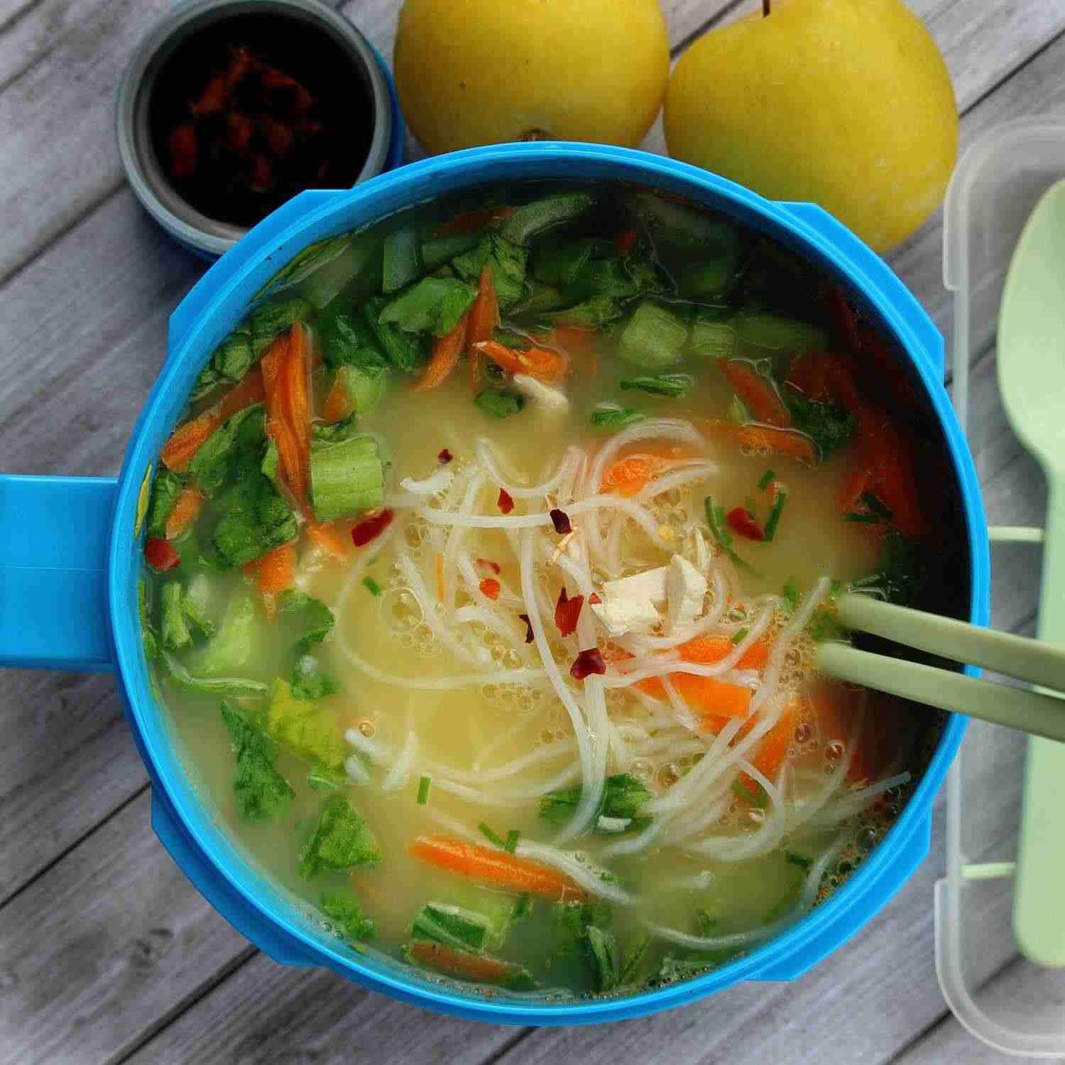 Combine rice noodles, chicken, bok choy, carrot, green onion, dashi, nutritional yeast, ginger, black pepper, white pepper, and red pepper flakes in a large, portable bowl with a lid.