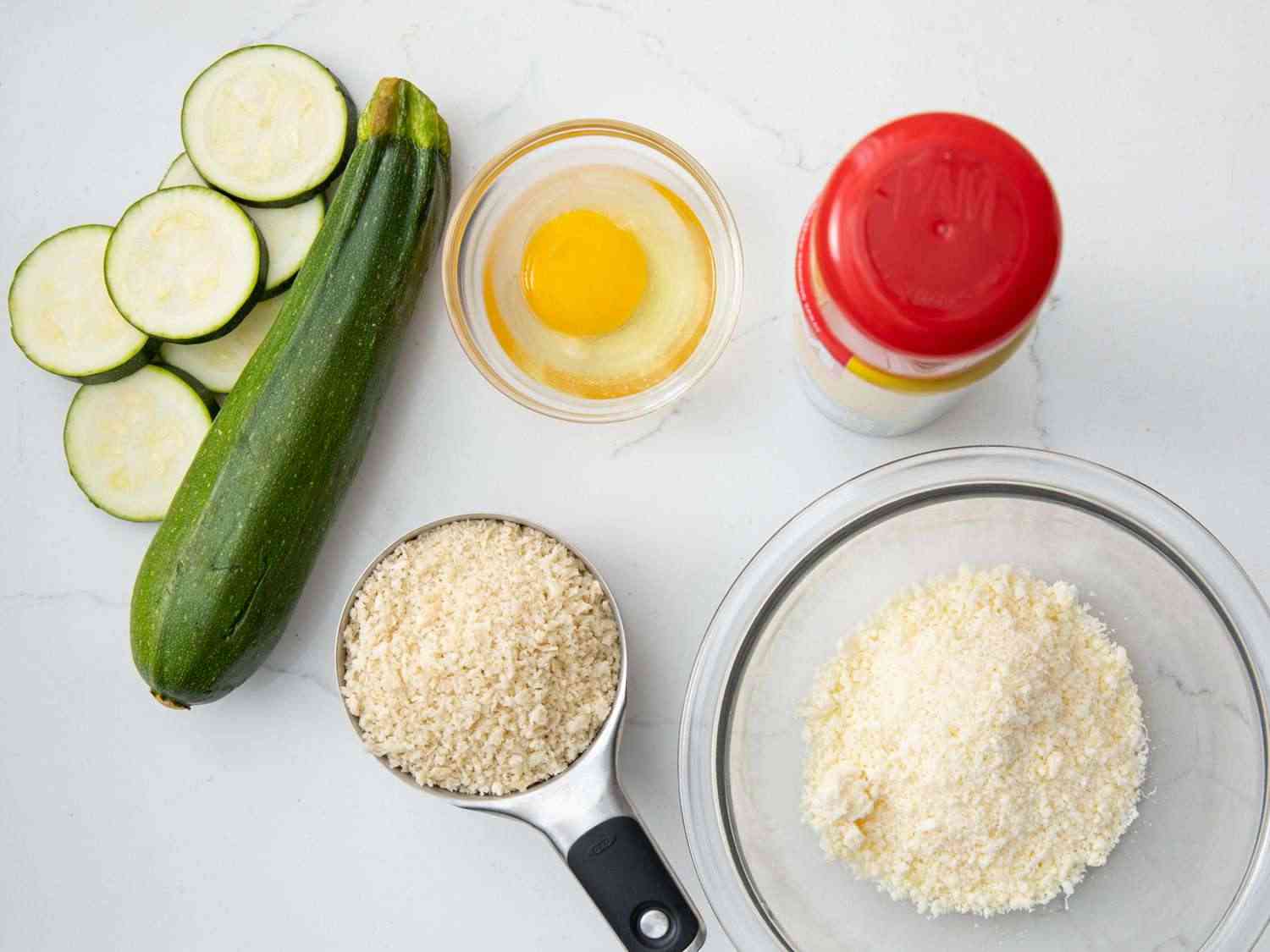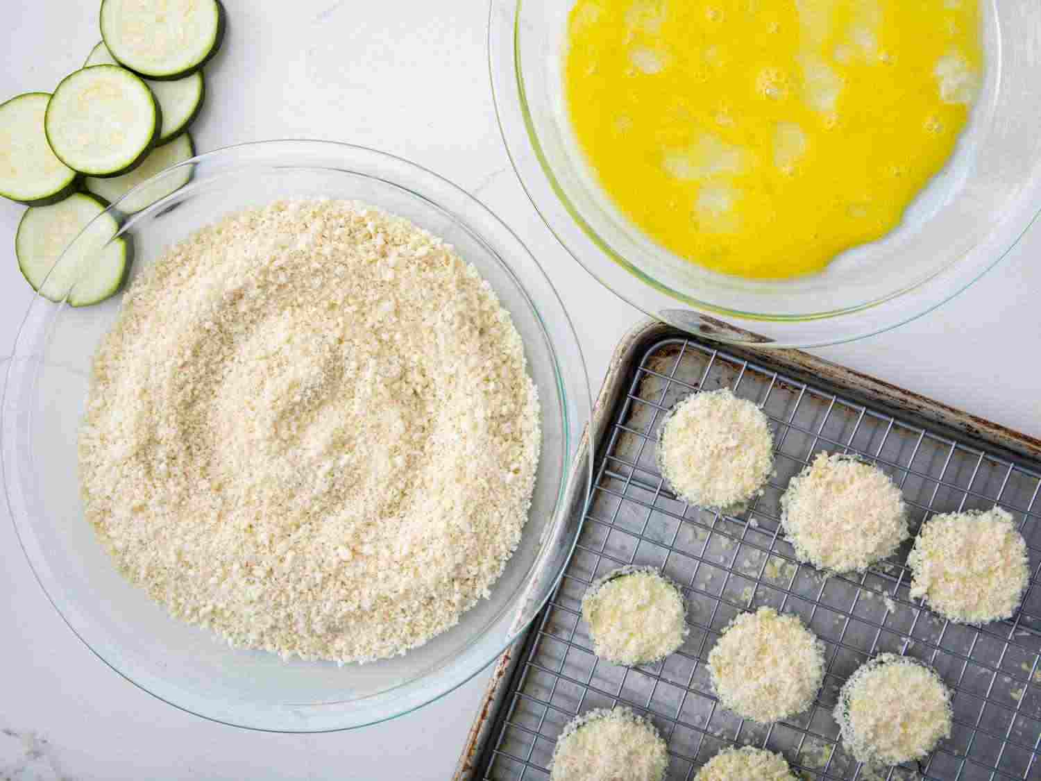 Combine panko and Parmesan cheese on a plate. Dip 1 zucchini slice into beaten egg then into panko mixture, pressing to coat. Place zucchini slice on a wire baking rack and repeat with remaining slices. Lightly spray zucchini slices with cooking spray. Dotdash Meredith Food Studios