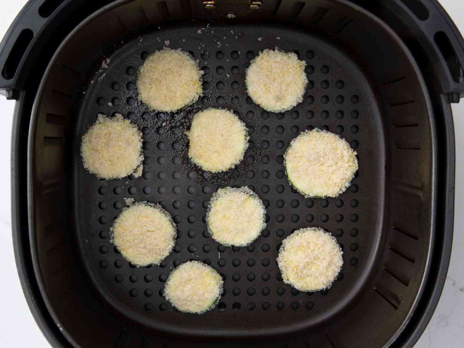 Cook in the preheated air fryer for 10 minutes; flip the slices and cook 2 minutes more. Repeat with remaining zucchini slices. Dotdash Meredith Food Studios