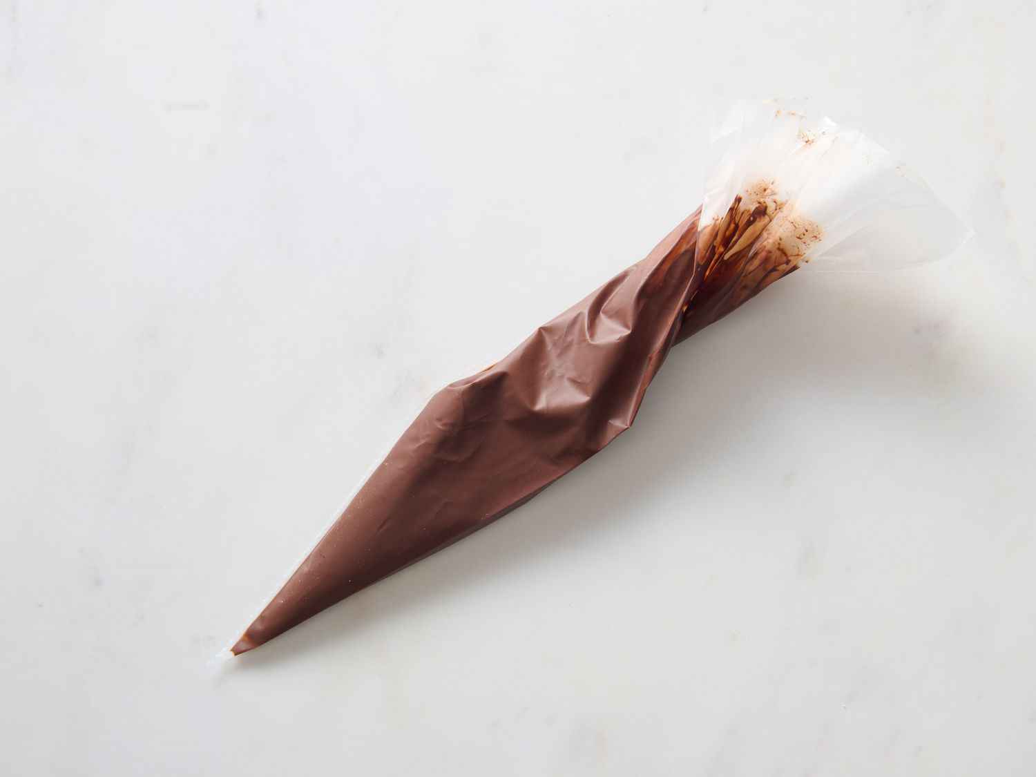 - Step 4:Cool chocolate for 1 to 2 minutes. Spoon chocolate into a piping bag or a plastic bag with a corner snipped. Allrecipes/Julia Hartbeck